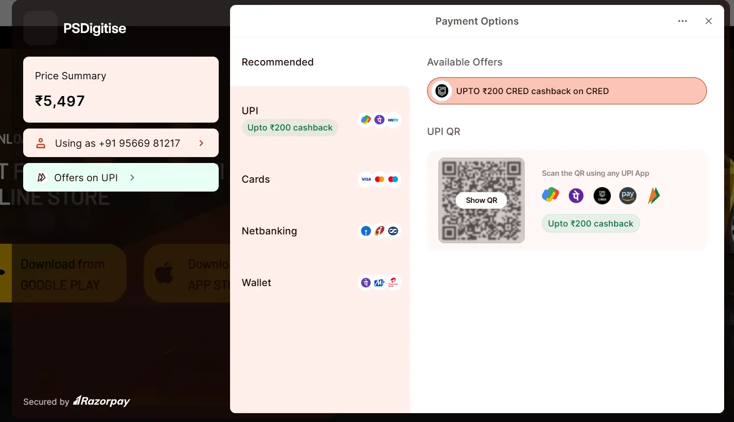 - Multiple payment methods supported: credit cards, wallets (e.g., Paytm, Google Pay), and UPI.