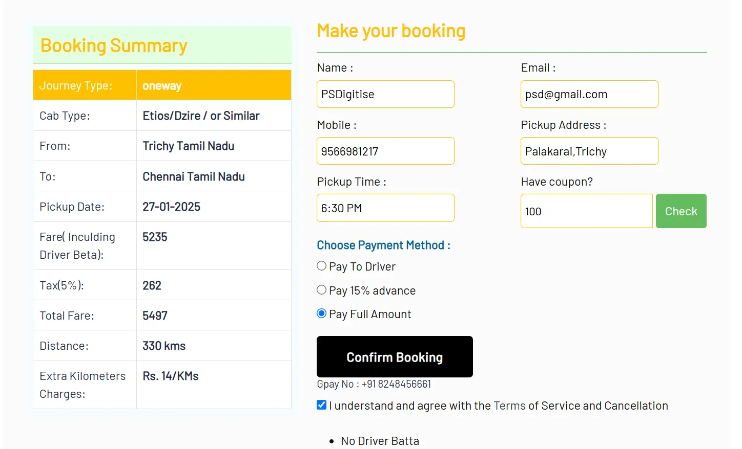 - Confirm booking and receive driver details.